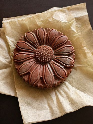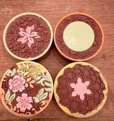compressed cake, fudge texture, dipped in milk, white or dark chocolate. Individually wrapped.
